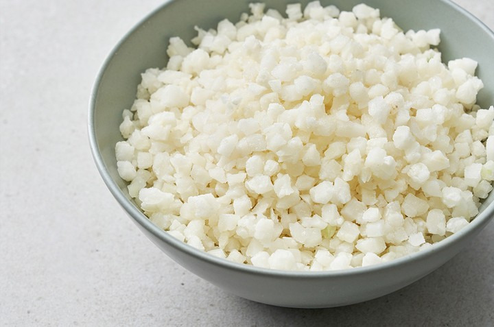 - 콜리플라워를 잘게 다지거나 식품가공기에 넣어 ‘쌀 알갱이 크기’로 만들기.