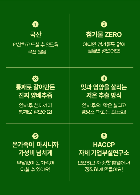 - 특징: 100% 국내산 양배추 착즙, 건강즙